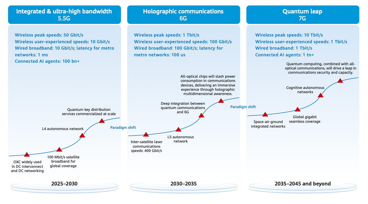 2035: 6G networks deliver roughly 100 Gbps user experience. Low-earth-orbit satellites enable global coverage. Core networks provide quantum key distribution services.