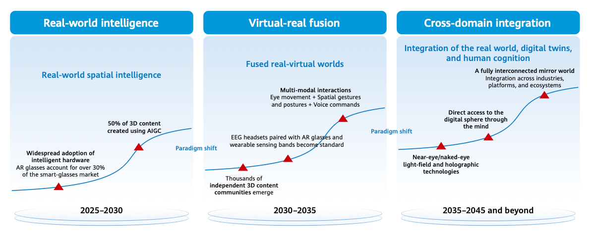 2030: Virtual-native social platforms scale alongside real-content platforms. Fully AIGC-built AAA games appear. A next-generation terminal architecture emerges: AR glasses paired with watches or bands and a separate compute unit (display–compute separation).