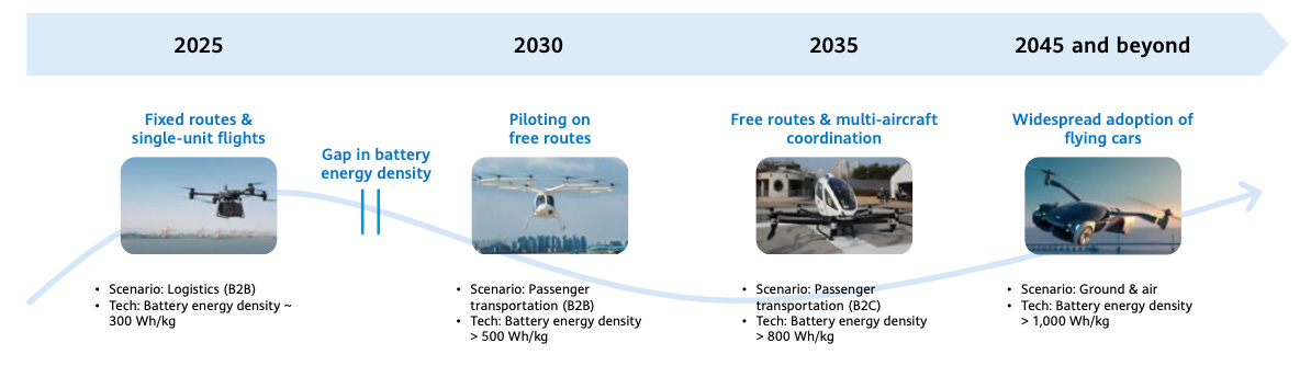 Today: Low-altitude electric vertical takeoff and landing (eVTOL) aircraft are mainly used for toB logistics. Operations rely on fixed routes and single-aircraft flights, with limited passenger use.