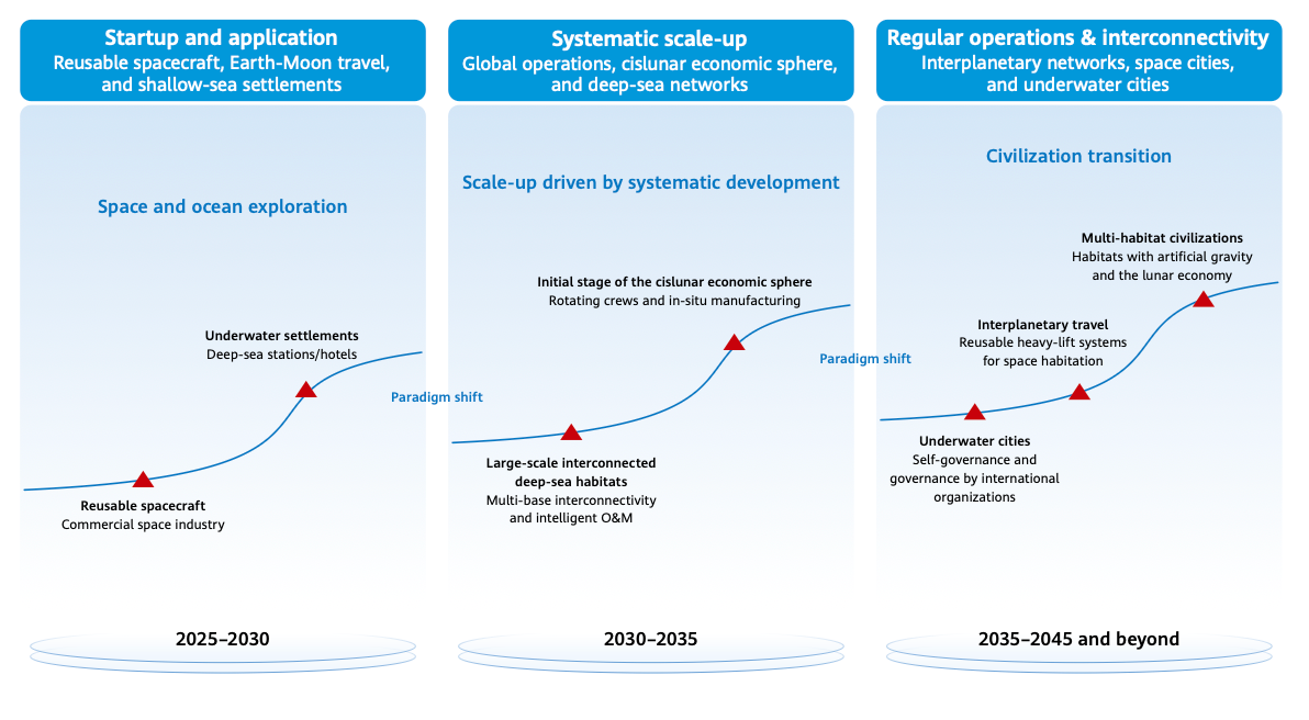 2040s: Hundred-person deep-sea cities become operational, maintained by AI and robotic swarm systems. Routine interplanetary travel begins. Lunar industrialization enters a substantive phase. Mars outposts achieve partial self-sufficiency.