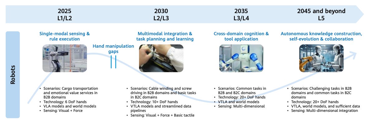 2049 (L5): General-purpose robots reach full maturity. High-end systems fall to consumer-electronics price levels (several thousand RMB) and become as widespread as smartphones.