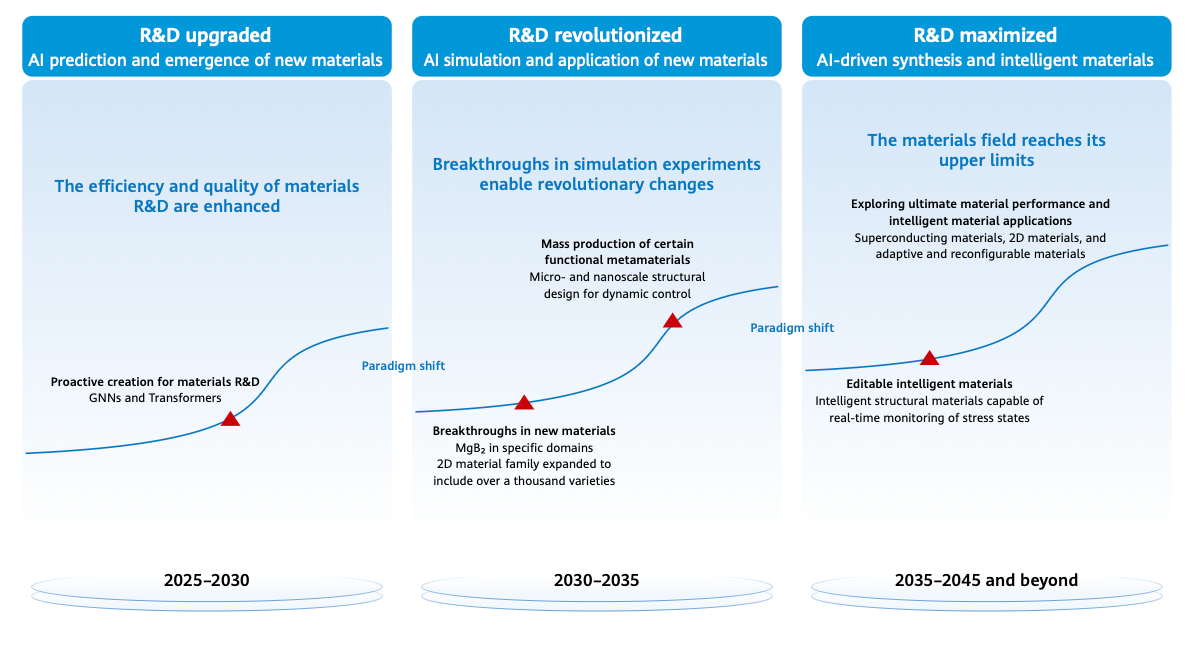 2035: Ecosystems combining reusable models with high-throughput validation mature. Material development cycles shrink from over a decade to under one year. Programmable materials enter early commercialization in flexible actuators and variable-stiffness exoskeletons.